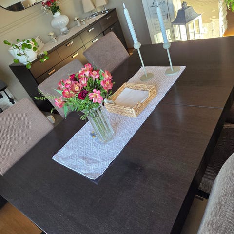 Pent brukt spisebord med 8 stoler, ved bord er 6 med vi har 2 ekstra så total 8 stoler.