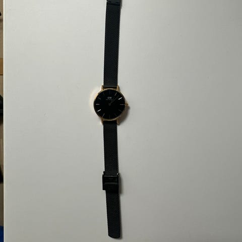Daniel Wellington Dame klokke med svart rem og hvit urskive. Klokken har et enkelt og klassisk design.