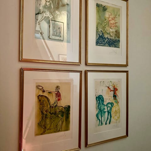Et vakkert bilde i varme toner av Salvador Dali. Det heter «Butterfly And The Bullfighter», fra 1970. Det er merket med EA ( Epreuve d’ artiste )som betyr at det er et trykk som er holdt utenom det regulære salgsopplaget ( som ville vært nummerert ). Det er rammet inn med hvit passe-partout i en gyllen ramme. Selve bildet måler 72 x 53 cm. Med ramme 96 x 74 cm.