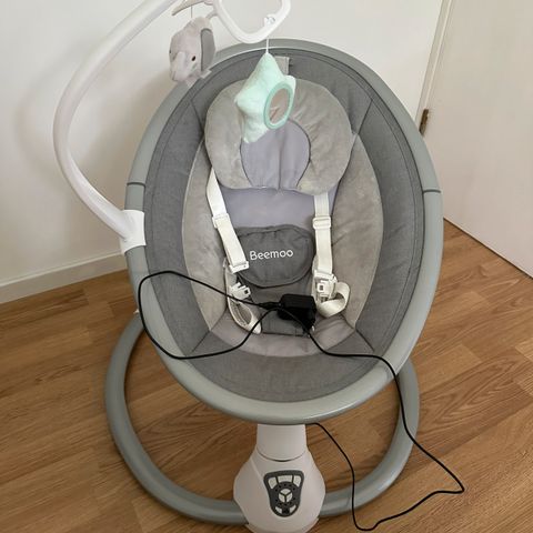 Beemoo PLAY Rocker Low, en fin vippestol med et stilig design. Gyngefunksjonen får vippestolen til å bevege seg sidelengs og kan stilles inn i fem forskjellige hastigheter. Musikken består av flere rolige melodier, volumet kan heves og senkes. Stolen har en timer-funksjon som kan stilles til 15, 30 eller 60 minutter.
