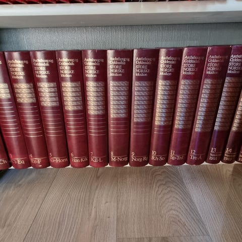 Aschehoug og Gyldendal Store Norske Leksikon bokserie består av flere bind med omfattende leksikoninnhold. Bøkene har brun innbinding med gulltekst på ryggen og dekker ulike emner i alfabetisk rekkefølge. Totalt 13 bøker. Kom gjerne med bud