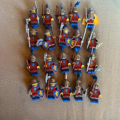 LEGO Kingdoms minifigurer med ulike rustninger og tilbehør som hjelmer, skjold og våpen. Settet inkluderer fem minifigurer med røde og blå detaljer, egnet for samling eller lek. Gamle og slitte, men noe for den som husker dem fra sine glansdager