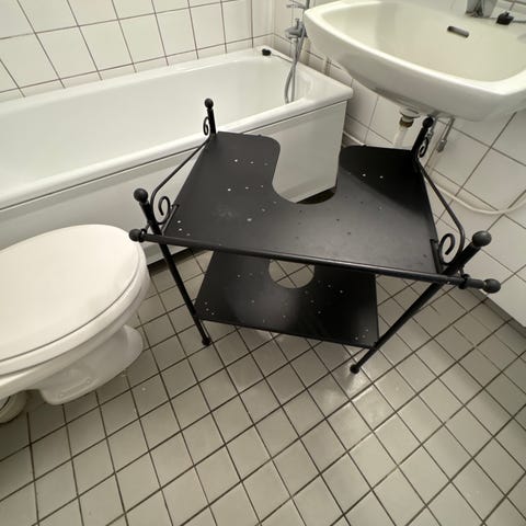 Hjørnehylle med flere glasshyller og svart metallramme. Egnet for oppbevaring av små gjenstander som parfymeflasker, hudpleieprodukter og annet tilbehør. Selger pga flytting!