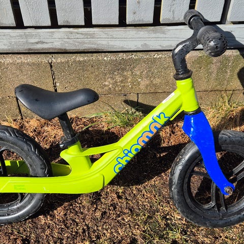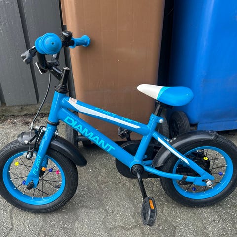 Barnesykkel med 12 tommers hjul i blå og rød farge. Utstyrt med støttehjul og pedaler. Passer for små barn som skal lære å sykle.