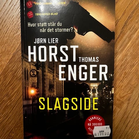 Innbundet, "Slagside" av Jørn Lier Horst og Thomas Enger selges for 35kr.