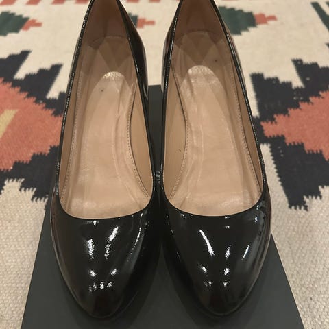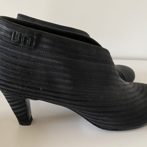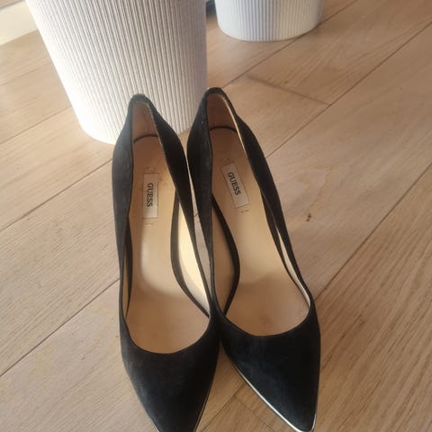 Sko med Stiletthæler i semsket sort skinn selges billig da de har mistet noen små stener på hælene. Er ikke veldig synlig når man har de på. Kun brukt en eneste gang. Har dustbag. Finere og enda mer elegante enn det som kommer frem på bildene. Kostet 1.800kr.