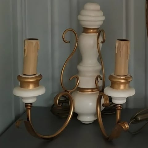 Ca 38 cm høyde på selve lampen. Skjermen kan du vende på som du vil. Lyspære følger med. Ledning med jordet støpsel som passer til dagens stikkontakter. Bryter på ledningen. Her mangler én skrue til å feste lampen i opphenget. Den andre er der. Skal de skiftes ut er det nok penest å ha like skruer på begge sider (svart/brun/gull).