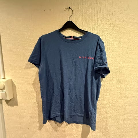 Selger en stilig Tommy Hilfiger t-skjorte i str. L med kult palmemønster på fronten og sydde detaljer/logo: “Hilfiger Beach House”. T-skjorten er i 100% bomull, myk og komfortabel, og passer perfekt både til sommerbruk og hverdags.