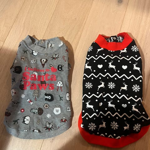 Selger to helt ubrukte julegensere til hund. Det står bare onesize på de, men vil tro de passer hunder ca størrelse dansk-svensk gårdshund og lignende. 50 kr pr stk