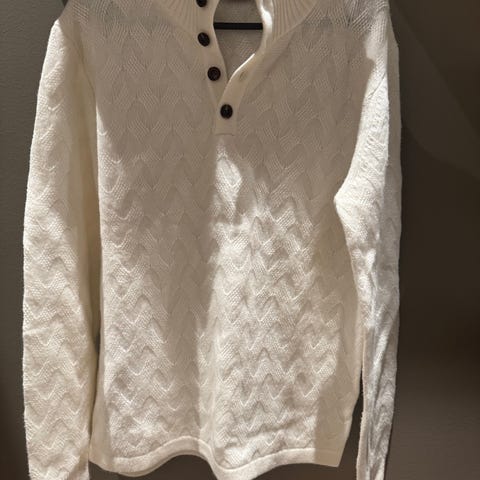 Genseren har en unik krage med treknapp-detalj og et grovt, eksklusivt strikkemønster. Sitter fint og er varm uten å være tung. Passer perfekt til høst og vinter.