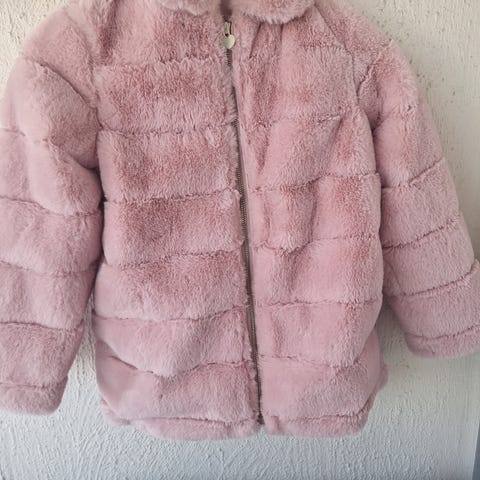 Fuskepelsjakke i størrelse 134. Kjøpt i London på Primark. Denne er brukt én gang, og fremstår derfor som ubrukt. Jakken er rosa og laget av fuskepels materiale. Den har hette, lommer og glidelås foran. Deilig og myk.