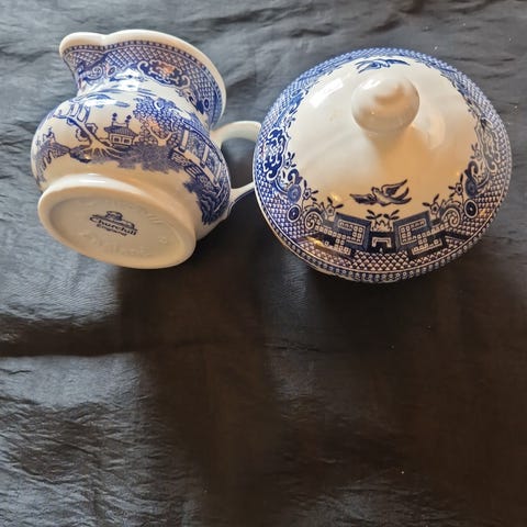 Nydelig blå dekor med hvit bunnfarge. Alt ser ut til og være i grei / god stand .