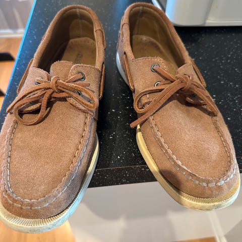 Selger et par Sperry Top-Sider i klassisk mokkasinstil. Skoene er brukt, men fortsatt i god stand uten strukturelle skader. Litt kosmetisk slitasje og noen merker i skinnet (se bilder), samt noe støv fra lagring. Yttersålene er pene og viser lite slitasje.