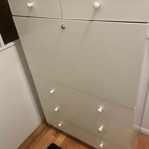 Solid hvit skoskap med tre rom. Tar veldig lite breddeplass. Ypperlig for de med liten gang