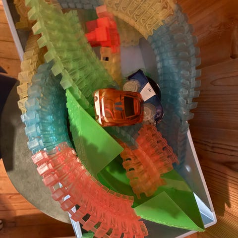 Speedcar Bilbana Glow In The Dark er en kul bilbane som har lysende deler som lyser opp i mørket. Bilbanen har dobbel sløyfe og en radiostyrt bil.