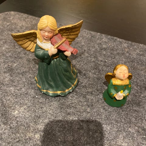 Juleengel i glitrende ulltråd med gullvinger sydd av diverse perler. Håndlaget. Har noen ferdige og kan også lage på bestilling.