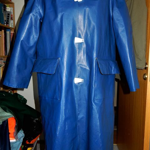 Kul, sort regnfrakk i litt «shiny» PVC-stoff med quiltet boblefôr som gjør den varm og god. Godt egnet for kjølig, vått vær (høst/vår, mild vinter). Elegant, rett modell med lang splitt bak. Glidelåslukking og lommer i sidene. Pent brukt, ingen bruksmerker.