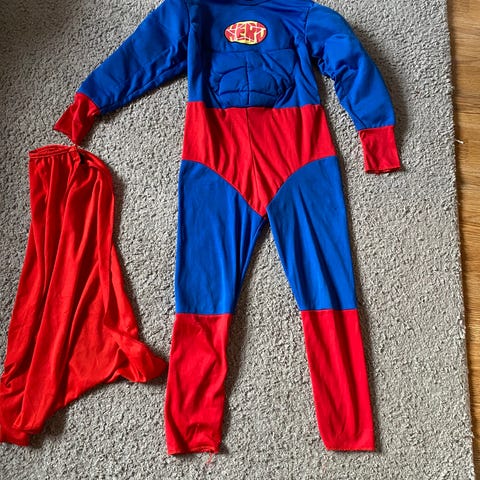 Selger et normalt brukt superhelt kostyme med innebygde muskler 💪 Det står one size, men mener og tror den passer fra sånn 4-5år og opp mot 8år, (den passa på gutten min til han var 8år iallefall). Ingen hull og flekker av det jeg kan se.