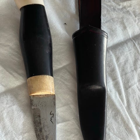 Tydelige bruksspor og alderspreg – dette er en ekte gammel brukskniv, ikke en ny replika.
