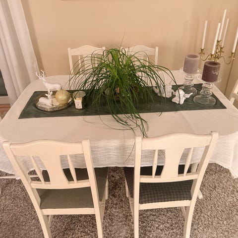 Høyglans overflate, med flere bruksmerker. Alle merker har blitt tatt bildet av. Bordbenene er blitt spraylakket med messing farve, begynner å slite seg av. Gis bort som den, fortsatt mye bord igjen og må hentes.