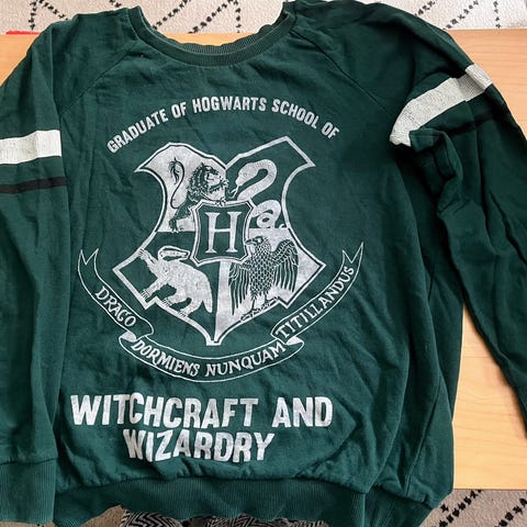 Harry Potter T-skjorte selges. Offisiell Harry Potter-merch i burgunder med “Gryffindor 07 / H. Potter” og glittertrykk foran. Kjøpt i Orlando. Sporty college-stil med hvite striper på ermer og krage. Størrelse 10/11 år (passer ca. barn 9–11 år, avhengig av høyde).