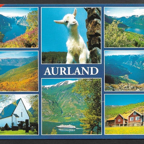 Postkort med motiv fra Undredal i Aurdal, inkludert Aurlandsfjoeden, landskap, gårder og sauer. Pent, ubrukt A6-format. Se bilder