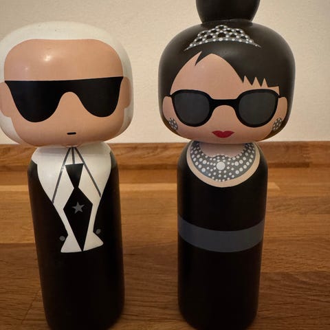 Lucie Kaas trefigurer i flerfargede design. Figurene er laget i tre og har malt overflate med stiliserte menneskemotiver. Egner seg som dekorasjon i hjemmet, for eksempel på hylle, skrivebord eller i stue. Leveres som to separate figurer i matchende stil.