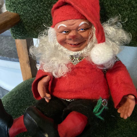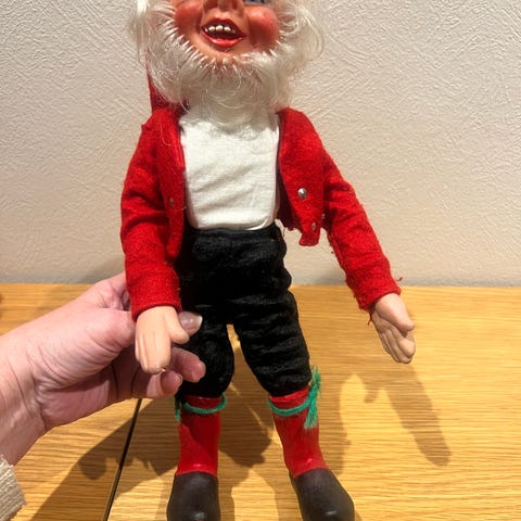 Gammel norsk produsert morsom Arne Hasle Latex julenisse. Stemplet under føttene Latex Norge. Ca 34-35 cm høy. Fin stand.