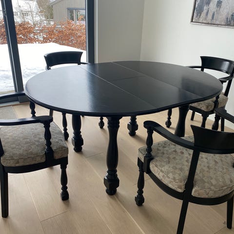 Rustikk spisestue i massivt gummitre,laget i India. To klaffer medfølger og åtte stoler med skinnseter. Bordet er godt brukt med naturlige årringer og rustikke metalldetaljer. Stolene har kryssmønstret rygg og en varm brunbeiset finish som matcher bordet. Noen av stolene har små riper på bena pga hund. Bordet har blitt bleket av solen sammenlignet med klaffene som da er mørkere. Bordet kan pusses og oljes for finere finnish.’ Bordet er gammelt kjøpt på Mio i Sverige.