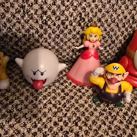 Selger en pakke med Mariofigurer til 450 kroner. Kan sendes mot at kjøper betaler frakt. For eksempel 69,- med postnord.