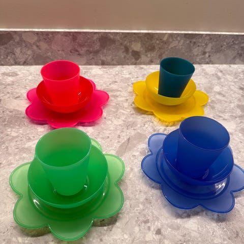 Sett med 4xkopper 4x tilhørende fat, 1x vannmugge (med lokk),1x krukke med lokk og 1x melkemugge