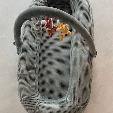 Carena Vugge barneseng med hvit tekstil og flettet håndtak. Vuggen har et bærbar design med stativ som gjør den egnet for nyfødte barn.