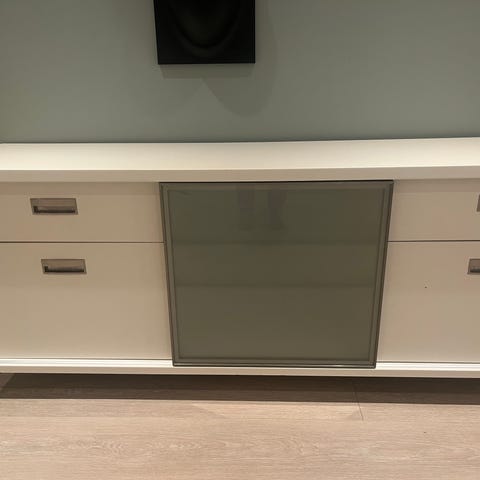 Pent brukt tv benk som no oppbevares i bod. Blitt brukt 1 års tid. Praktisk og fin, 2 store skuffer og hyller i midt del. Mål er på bilde