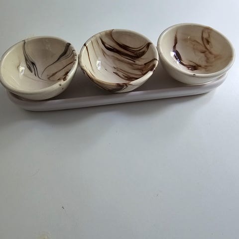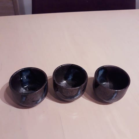 Små, søte, salt og pepper skål. H 4 cm, ø 3 cm ; ø 4 cm. Mangler en skje.