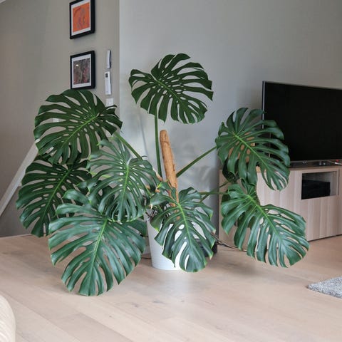 Stor Monstera Deliciosa stueplante med store, grønne blader og karakteristiske hull. Planten står i en hvit potte og er egnet for innendørs bruk. Hentes på Åstveit