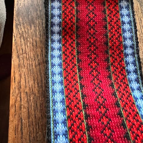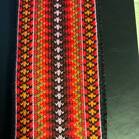 Nydelig belte i rosatoner m litt burgunder farger.blå stripe. Lengde belte 216 og bredde 11.3cm. Sender hvis ønskelig.