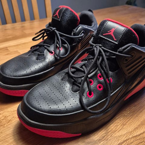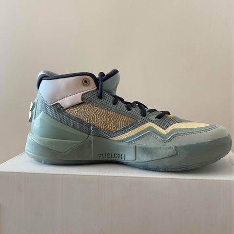 Skoene er hvite med blå og oransje detaljer, laget for basketballbruk.