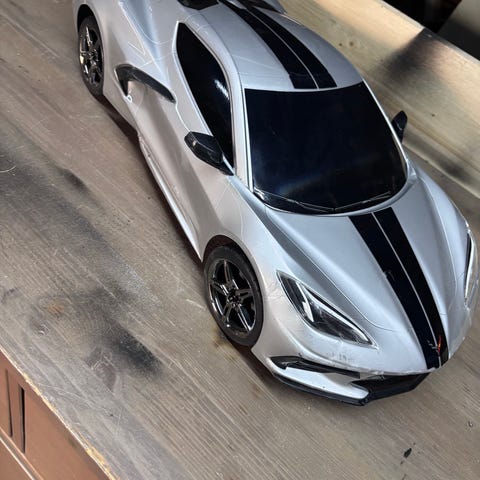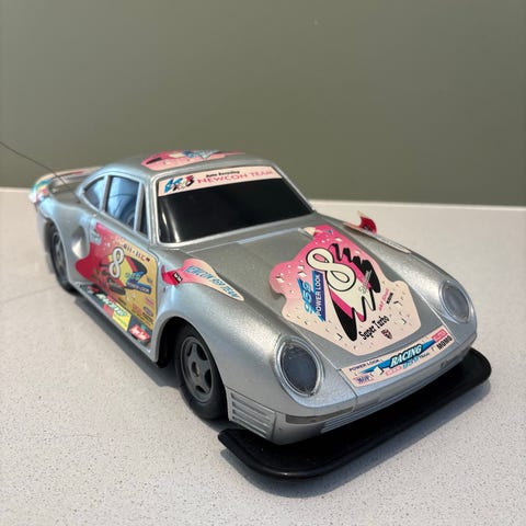Volkswagen Beetle modell bil i hvit farge med radioantenne. Modellen har detaljer som åpning av bakluke og en liten gul bil festet bak. Passer som samlerobjekt eller dekorasjon.