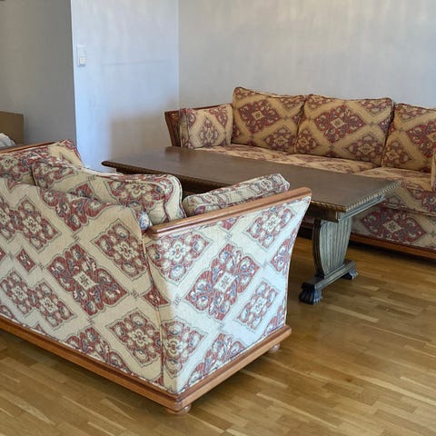 Brunstad 3 seter og 2,5 seter med orientalsk mønster gis bort. Trekket er i velur og bena er i kirsebærtre.