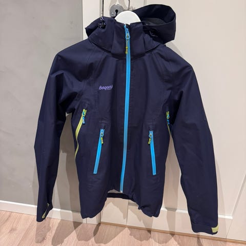 Helly Hansen regnjakke i vanntett og pustende materiale, blå farge, størrelse 164. Jakken har hette som enkelt kan tas av eller brettes inn i kragen bak. Jakken er brukt et par ganger og fremstår så god som ny.