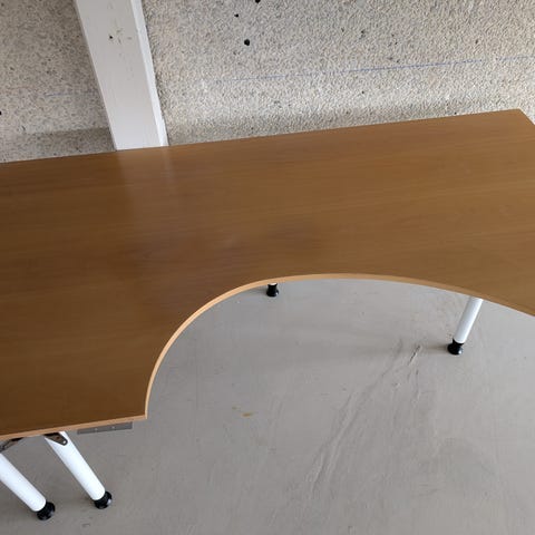 Kontormøbler ,hjørneskrivebord og bokhylle i trefarge. Skrivebordet har en L-formet utforming med metallben og inkluderer skuffer. Bokhyllen har flere åpne hyller for oppbevaring.