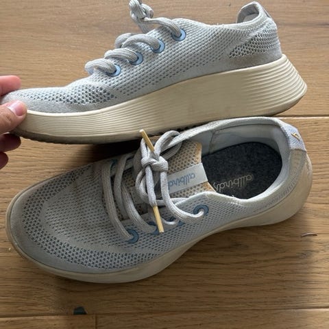 Allbirds røde sneakers / joggesko i størrelse 40. Skoene har en kombinasjon av tekstil og syntetisk materiale i oransje og røde toner. Sokkestruktur. Sålen har et mønster for grep. Passer til daglig bruk og lett trening.