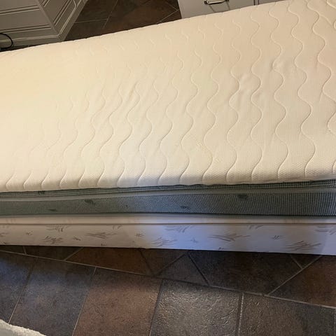 Gammel rammemadrass med noe nyere Wellpur overmadrass fra Jysk. Fungere like fint enda - mye takket være overmadrassen.