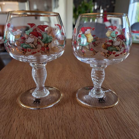 (To snapsglass med slitasje på gull og motiv kan følge med om ønskelig.)