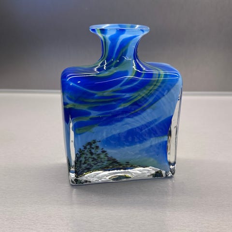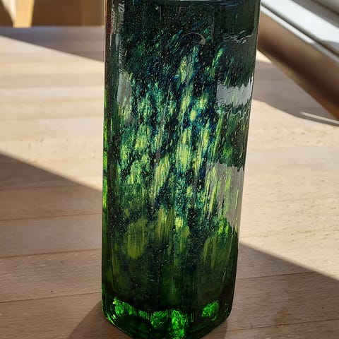 Pen vase i grønt glass med hvitt innslag. Fin vårgrønn farge til f. eks. påskedekorasjoner. Høyde ca 27 cm. Diameter i bunn ca 12 cm.