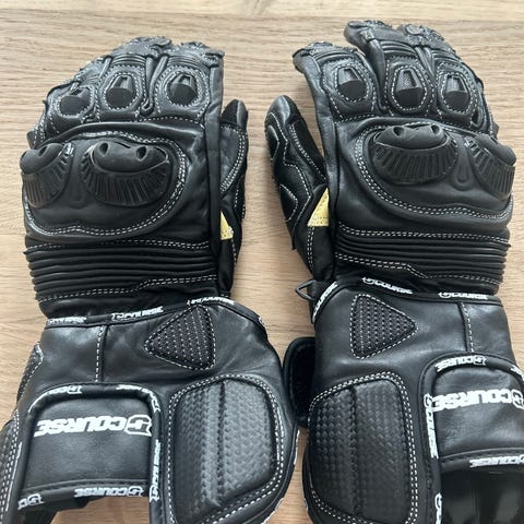 Büse Course MC-hansker i størrelse M, laget av svart skinn. Hanskene har beskyttelse på knoker og fingre, samt justerbar lukking ved håndleddet for bedre passform. Designet for motorsykkelbruk.