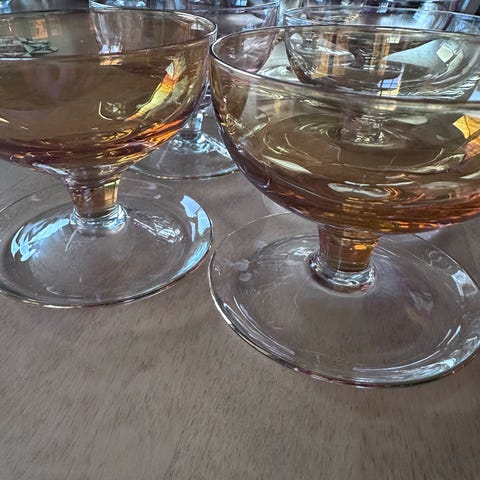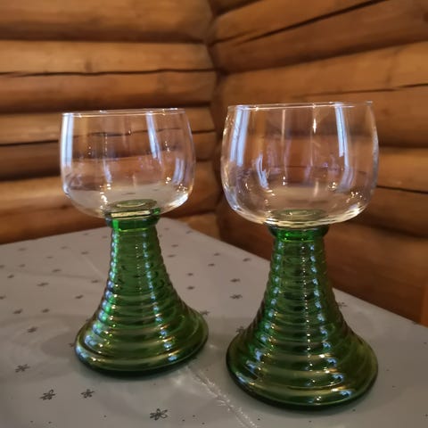 6 stk. Røhmer glass. Høyde 11,5 cm og rommer 0,1 l ( 1 dl). Det ene glasset har et skår under som ikke synes fra oversiden ( se på bildene). Selges samlet for 250kr. Må hentes I Skotselv. Sender ikke