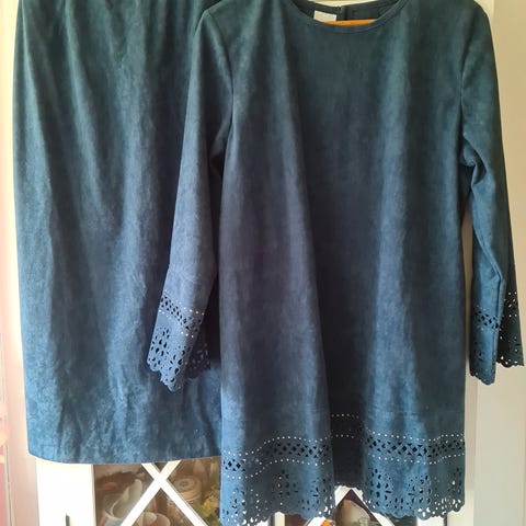 Skjorte og capri-bukse i tykt blått bomullsstoff. Str 46. Strikk i livet. Ubrukt.