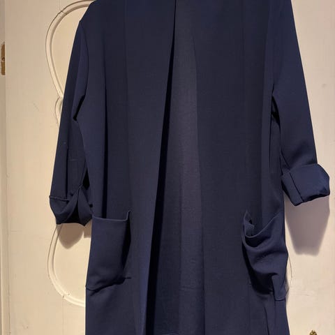 Zara blazer, navy. Passer til dame i størrelse M. Jakken har en klassisk design med krage og lommer. Stilig detalj med striper i foret.