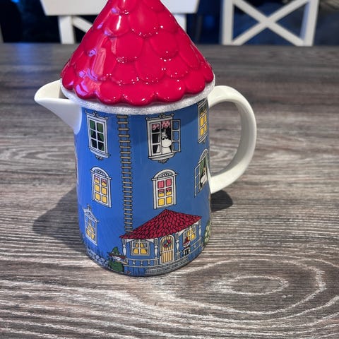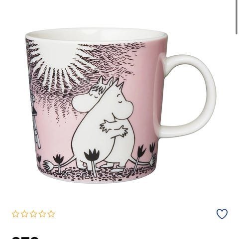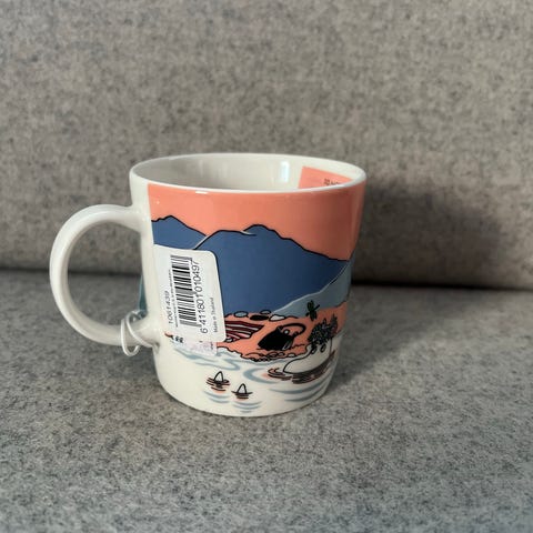 Arabia Mummi kopp med fargerikt motiv. Koppens design inkluderer karakterer fra Mummi-universet på grønn bakgrunn. Egnet for daglig bruk som drikkekopp.